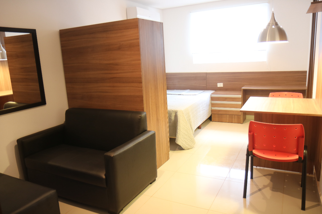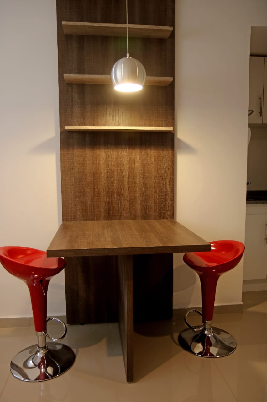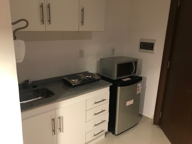 Comodidades: cocina con frigobar, cocinilla y microondas. Cama plaza y media, placard, mesa con butacas, sillon, etc.
